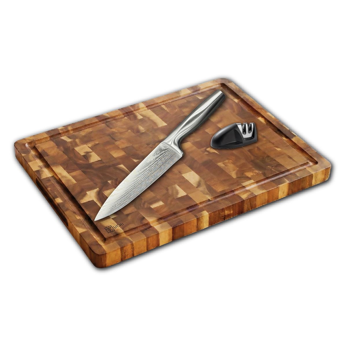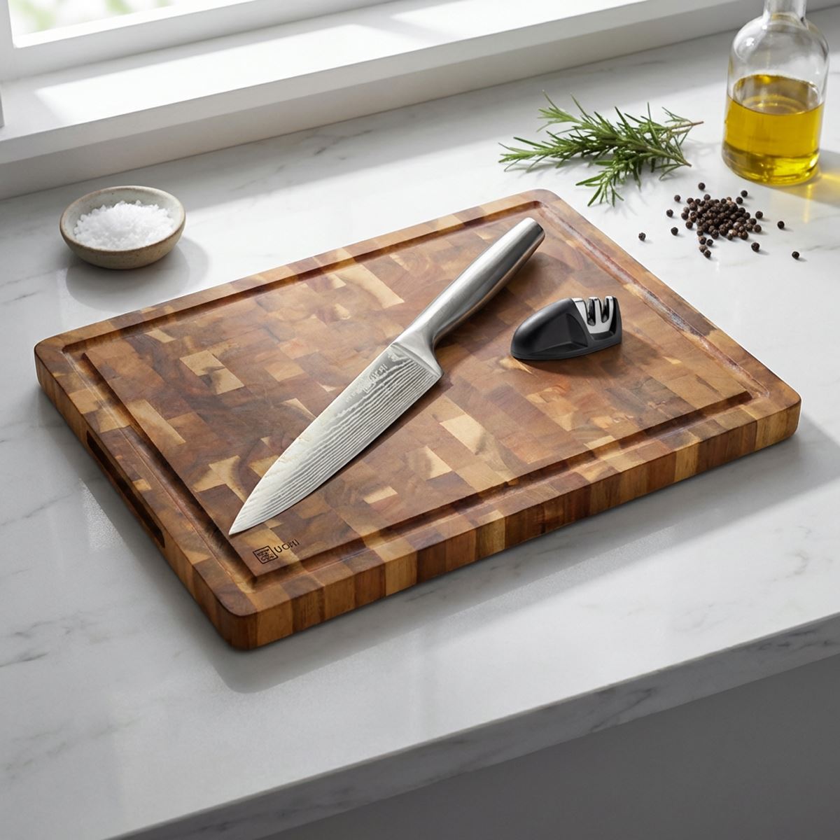 לוח בוצ׳ר מקצועי,סכין שף ומשחיז קרמי.