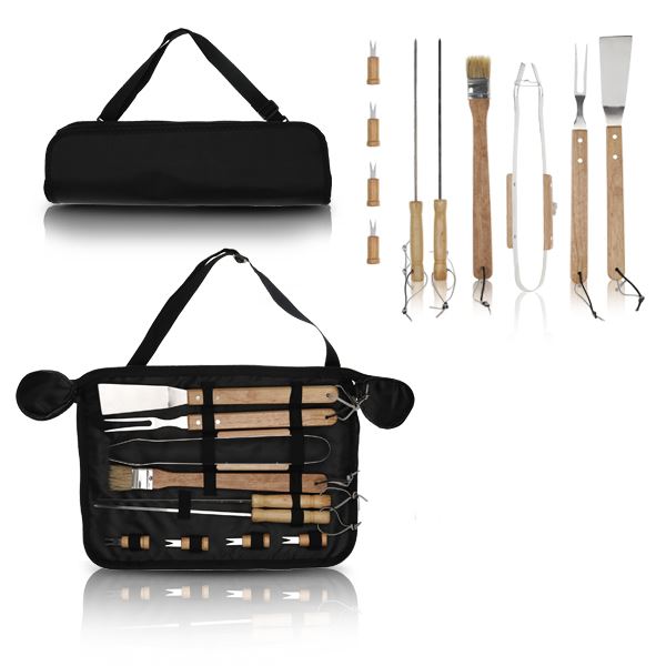 עם רצועות וידית אחיזה, הסט כולל: תרווד , מזלג , מלקחיים ,מברשת ,2 שיפודים ,4 דוקרנים