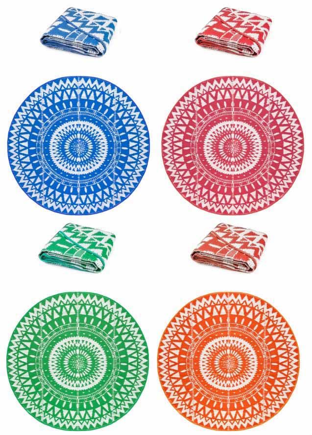 מחצלת חוף משפחתית עגולה ומעוטרת. 155 ס"מ קוטר. עשוי מפוליאסטר. מגיע בתוך תיק נשיאה עמיד אלבד עבה. מחצלת מדגם סום